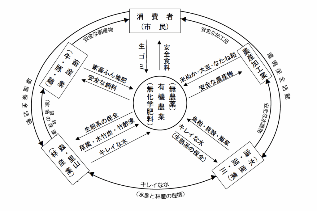 以上のように有機農法を取り入れた有機農業は、単に安全な食料を生産する役割だけでなく、重要な多面的機能を持っていることが理解できます。さらに次の循環図に示すように、この有機農業は、地域内でさまざまな自然環境域や関係産業と提携して、生産物や加工残渣の相互循環流通の中心的役割を担う「永続的・循環的農業」であり、それぞれの部門に安全な生産物や資源(水、大気)を提供すると共に、その部門から土作りや肥料となる素材を供給される中核的存在となります。